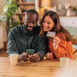 Smiling couple enjoying time together at their dining table, using a smartphone and credit card for online shopping and making secure payments in the comfort of their home